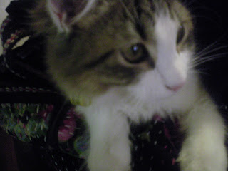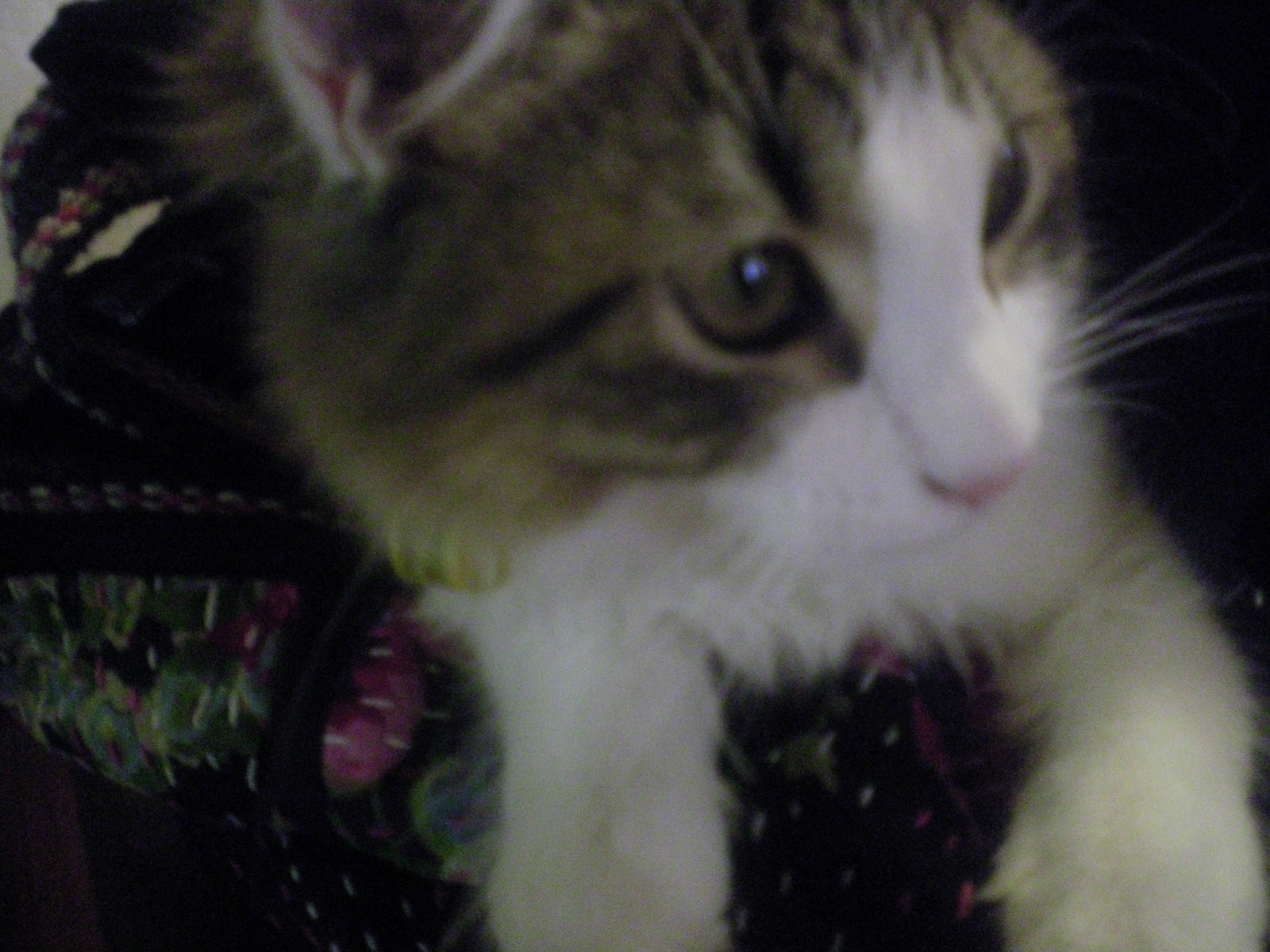 It took me a really long time to find a half decent photo of my kitten (pipper), she is no looking at the camera but its the best one i had and i dont have alot of patience :) There is nothing better to do on a rainy day then snuggle up with pip while she is purring.